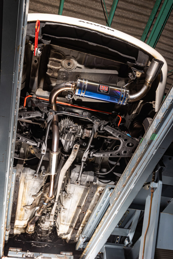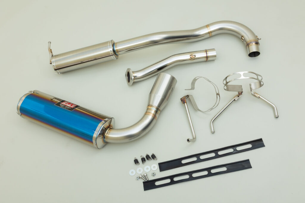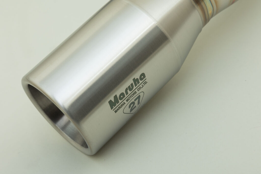 2022年にヨシムラと出会いがあった。その後、鈴鹿8耐に向かう当時の吉村不二雄社長と村田専務がマルハモータースに立ち寄り、そこからトントン拍子で事が進み、コラボしたマフラー開発が始まった。 普段ヨシムラで使用しているバイク用の1.2mm厚のステンレスパイプで、とても軽量に仕上げることが可能。パイプ径は触媒からサブサイレンサーまでの間はφ50.8mm、サブサイレンサーから後方はφ60.5mmを採用。全域でのパワーとトルクにこだわった結果、この組み合わせになった。