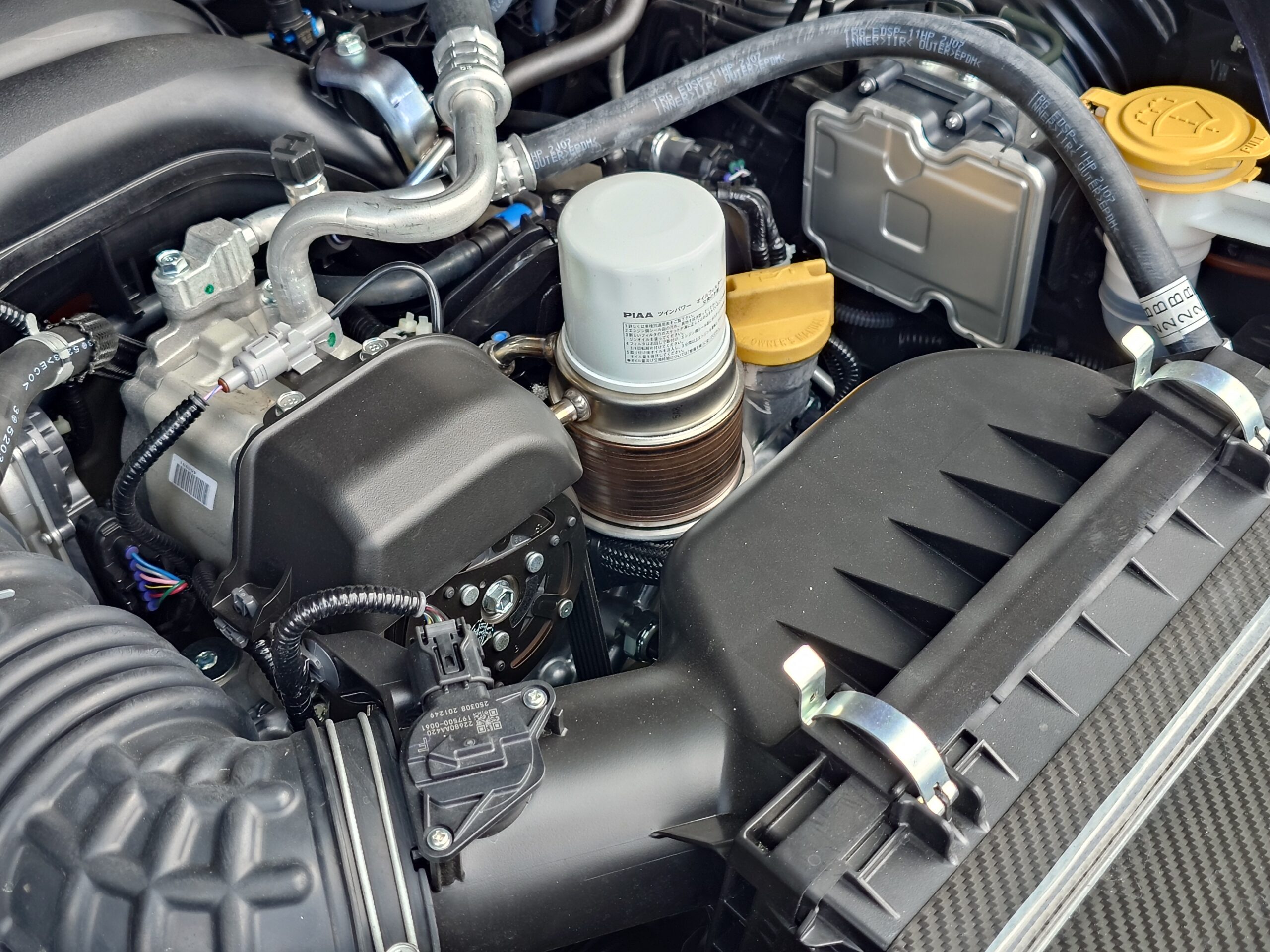 arise GR86 壱号車では空冷オイルクーラーを装着していたが、街乗りや冬場はオーバークール気味になっていた。そこで水冷オイルクーラーの容量をアップし、温度管理を行いやすくしている。