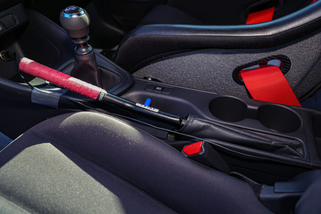 ジムカーナで必須となるサイドブレーキは、レバーを延長して操作性を上げている。ダンパーはエナペタル製で、スプリングはフロントがHYPERCOの12kg/mm、リアはCUSCOの8kg/mmを選択。アッパーマウントもCUSCO製となる。タイヤはPOTENZA RE-71RSで、サイズは205/45R16