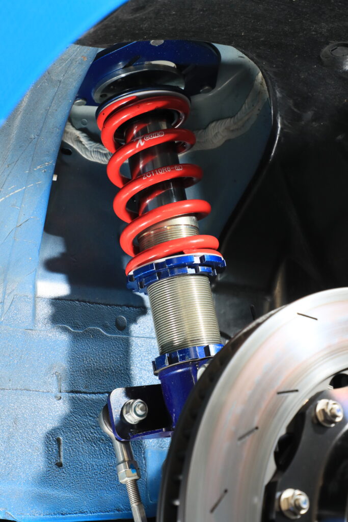 足まわりは従来どおり、ZEALベースのCSOスペック車高調キットを軸にセッティング。バネレートはフロント10kg/mm、リア12kg/mm。ブレーキ性能とのマッチングは良好で、今後は前後の車高バランスを詰めていく予定