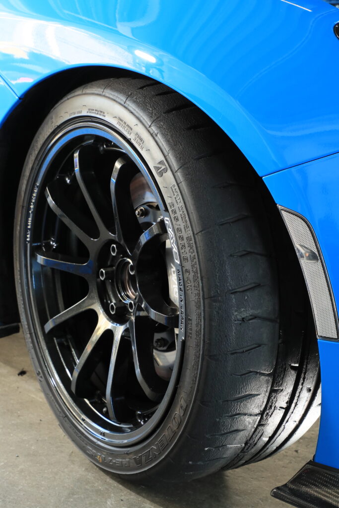 タイヤはPOTENZA RE-71RSおよびRE-12Dでデータ収集を実施。サイズは18インチ・255幅に加え、カスタマーの立場を考えた235幅でも検証を行い、装着パッドを含めたベストセットを模索している