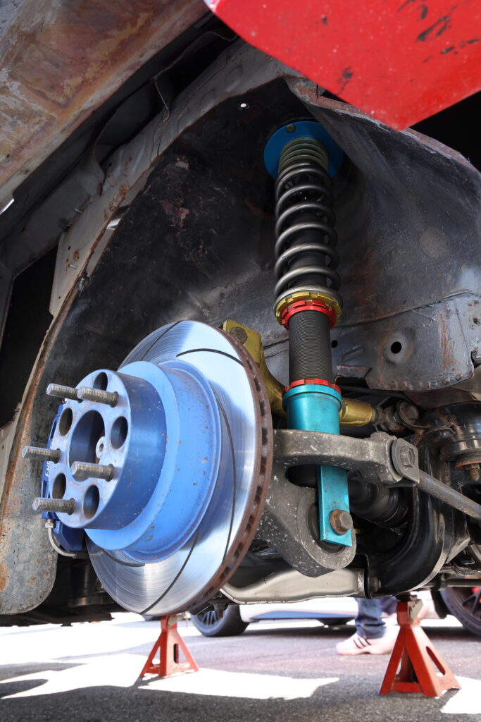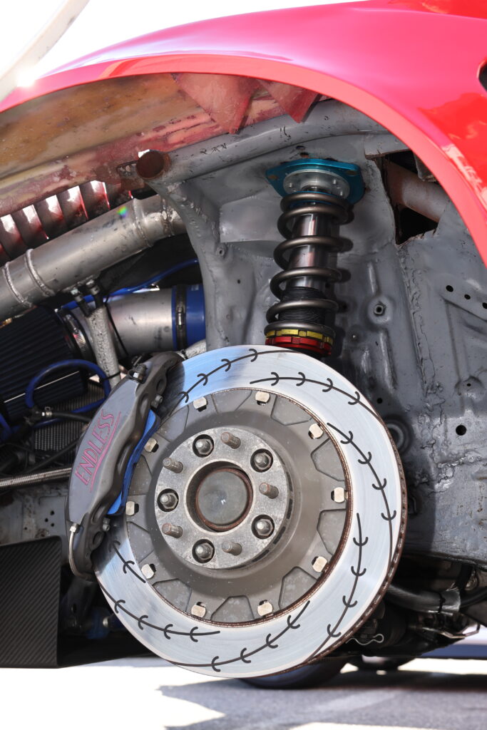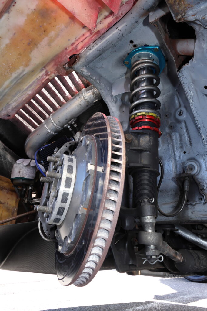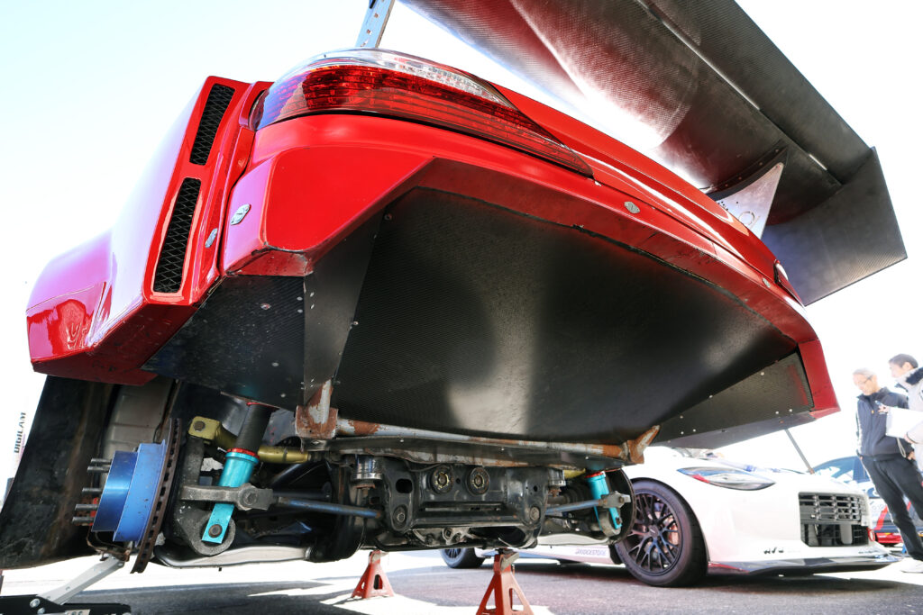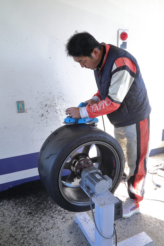 今回はADVAN A050 A1とSHIBATIRE R50 T9βの2種類のタイヤを装着している。タイヤ削り機も持ち込み、走行前にトレッド表面を加工。バネレートはフロント10kg/㎜、リア8kg/㎜だったが、強力なグリップに負けてダンロップ先での踏ん張りが効いていない印象もあったため、フロント12kg/㎜、リア10kg/㎜にレートアップした