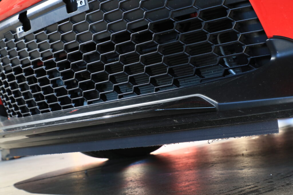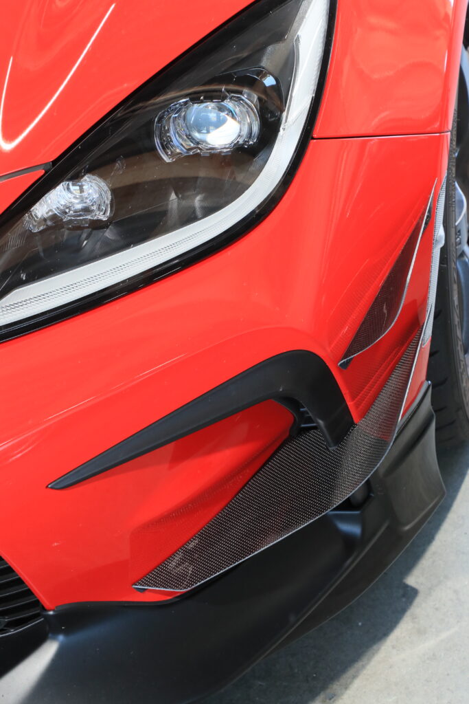 「前後のダウンフォースをバランスさせるのに、不可欠だった」と語るフロントリップスポイラー。トヨタ純正形状を参考にした自作パーツだが、想像以上の体感効果をもたらしたという