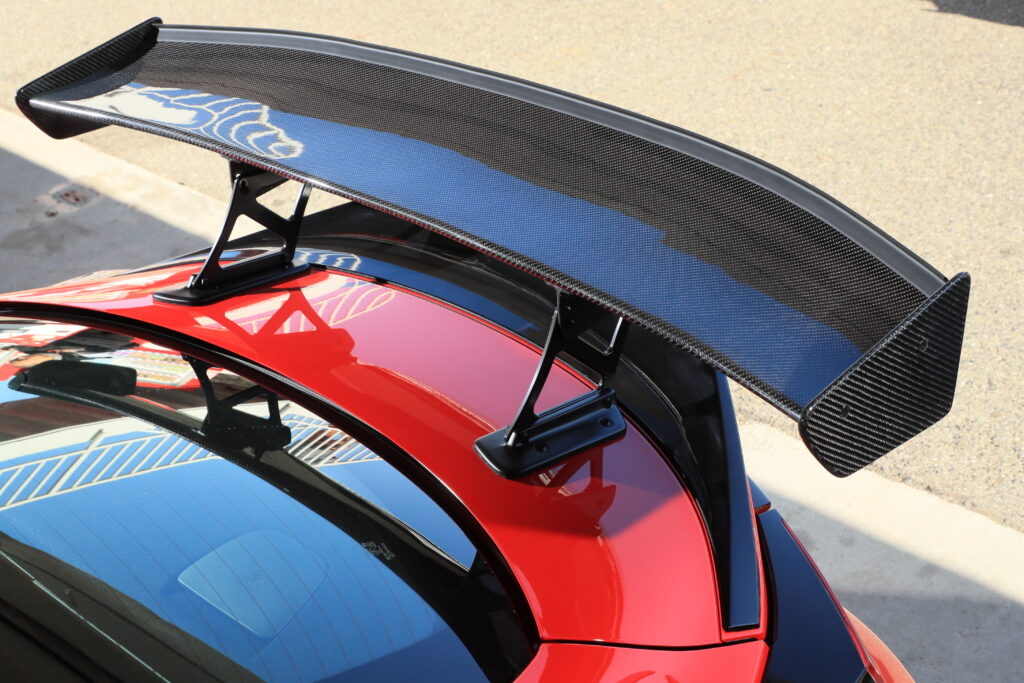 GTウイングは匠projectの3D-LINEを搭載。トランク開閉時のリアウインドウとの干渉を防ぐTYPEⅡを選択し、マウントは旋回性能を重視したローマウント仕様とした。角度調整とガーニーフラップにより、理想のダウンフォースを追求