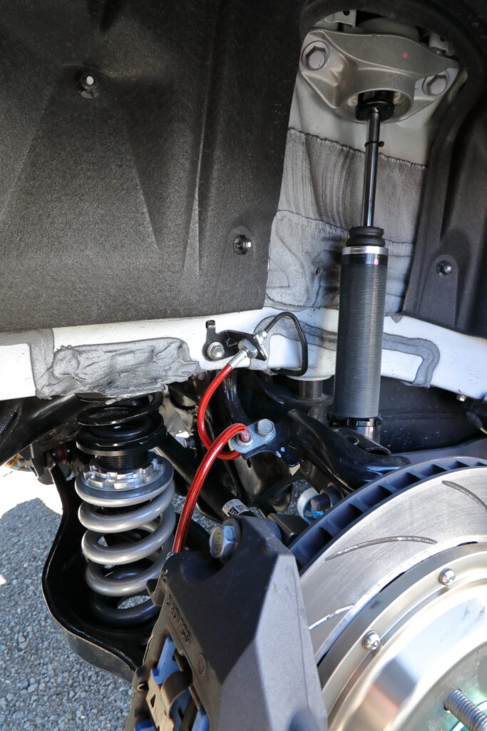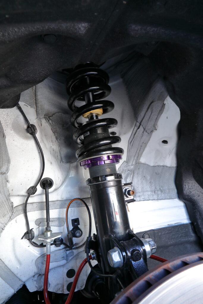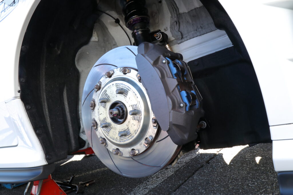 サスキットはD2 JAPANのレボリューションスペックで、DAT車でフロントが重いため、MT車よりフロントを2㎏/㎜レートアップしてきた。タイヤはRE-12D TYPE Aだ。