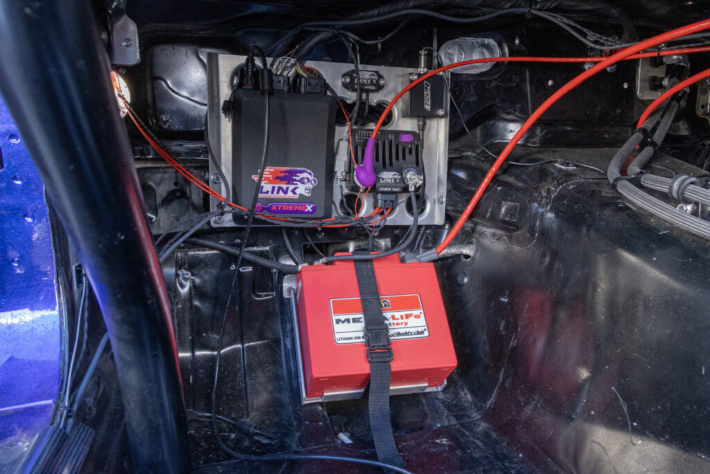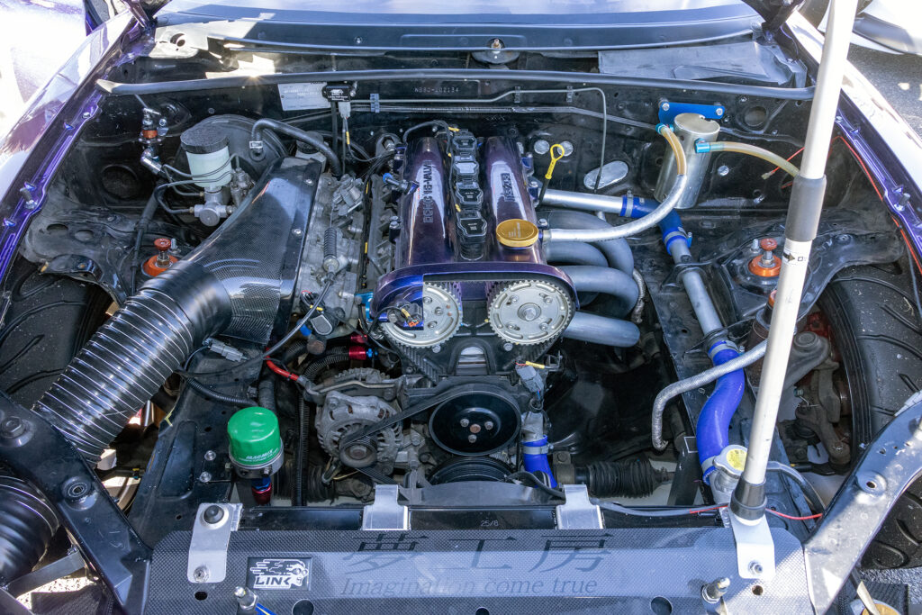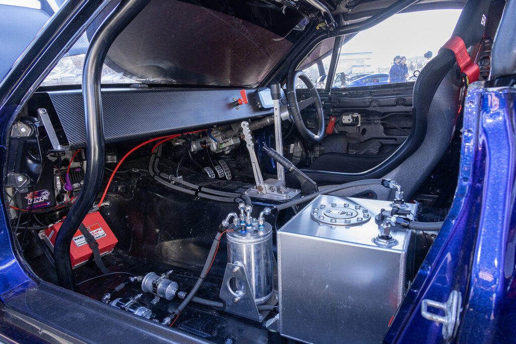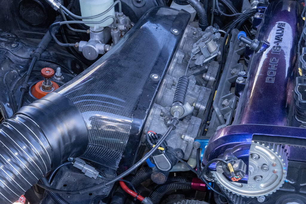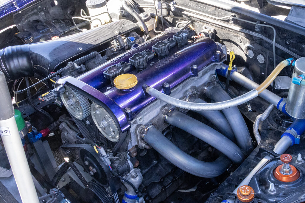 エンジンは4A-G用4スロを装着。ポート加工とハイカムを組む。さらに燃焼室形状を変更して燃焼効率を上げている。エキマニはチタン製でパイプ長を長く取るレイアウト。ECUはLinkを使っている。