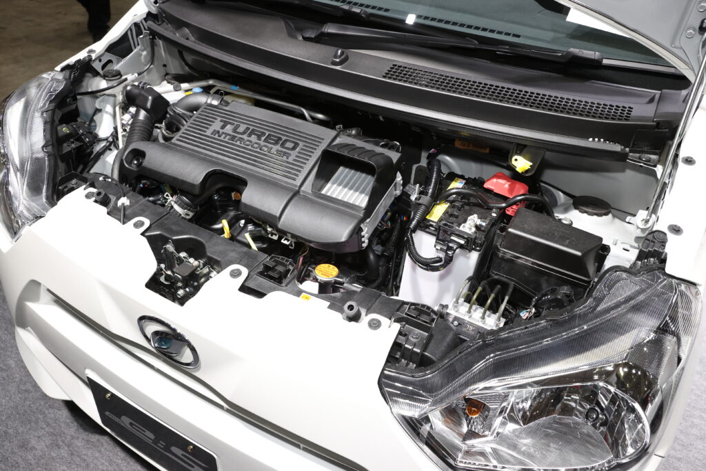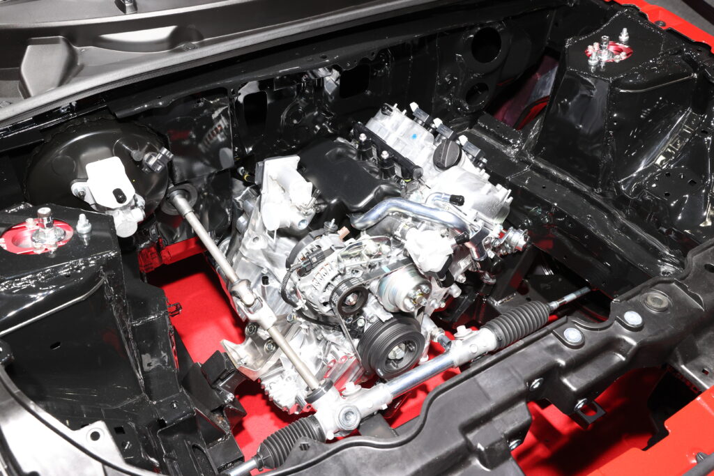 アトレーやハイゼットに積まれるKF型直列3気筒ターボエンジンは67°から40°に起こして搭載。シリンダーの角度が立ち気味となって、プラグ交換がしやすくなった。マウント位置は完全に前輪車軸の後方となり、ホイールベースの延長と相まって、フロントミッドシップを形成。前後の重量バランスを向上させている。