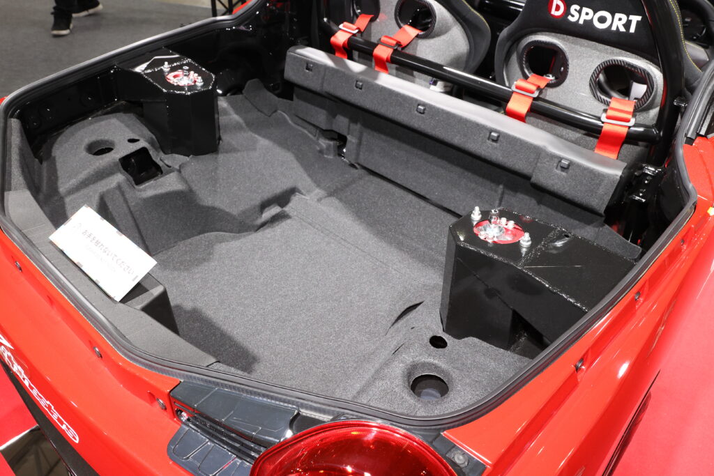 もう1台のラッピングが施された車両はD-SPORTS Racingの牽引ロープやフルバケットシート、追加メーター、サスキット、ブレーキパッドなどを備えたもの。ホイールはVOLK RACING CE28、タイヤはADVAN NEOVA AD09となっている。