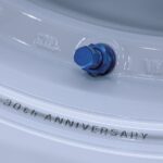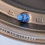 ロゴは当時を再現。スポークの左側が『VOLK Racing Wheel』で右側が『RAYS ENGINEERING』だ。初代と同じスポークステッカー仕様と、A.M.T.(高度マシニングテクノロジー)で入れ込んだマシニングロゴの2種類を設定。バルブのカラーは初代に合わせたブルー。バルブの真下付近、リムには『30th ANNIVERSARY』の文字が刻まれる