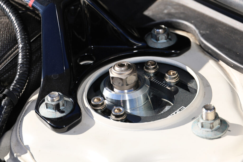398㎰のパワーを走りにつなげる。車高調はHKS HIPERMAXGATE SPEC。フロントはキャンバー調整式のピロアッパーマウントが標準で、デモカーは約3°つけている。A PITのタワーバーは入力に応じてしなるカーボンシャフト。剛性のセッティングにより、回頭性が上げられる。タイヤはG-maxの265/35R18サイズ