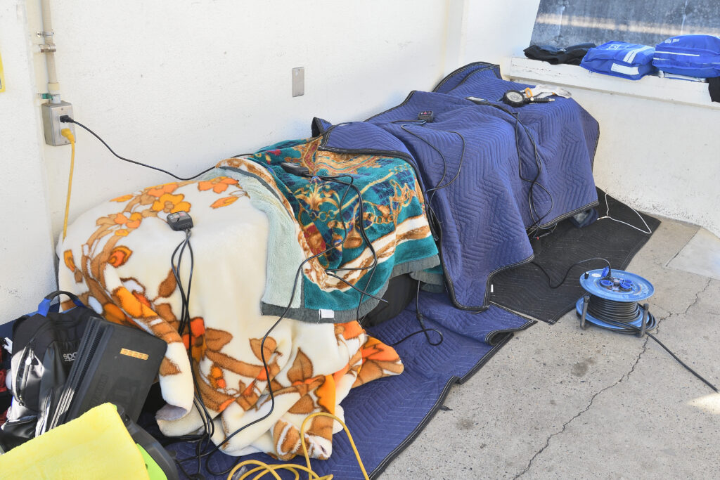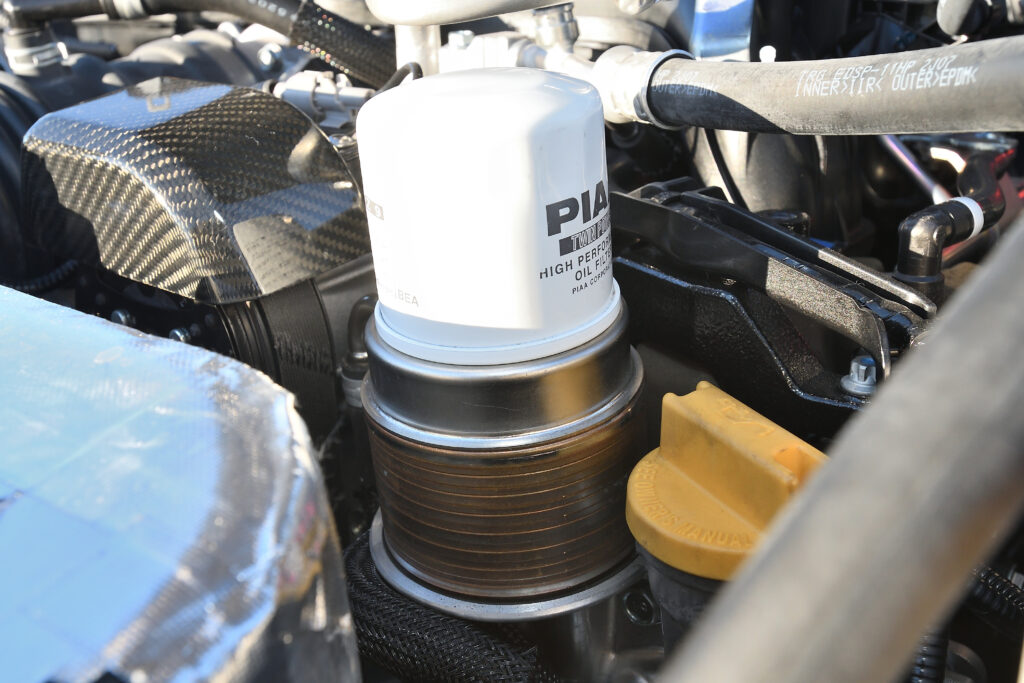 カスタマーが多く装着しているという、シバタイヤのR31 200Rを履く。路温が低い時期はウォームアップに時間が掛かるため、ウォーマーを用意した。エアボリュームや潰しやすさを重視して、あえて17インチをチョイス。油温対策にオリジナルの大容量ヒートエクスチェンジャーを装着する。空冷式ほど冷え過ぎず重量面でも有利
