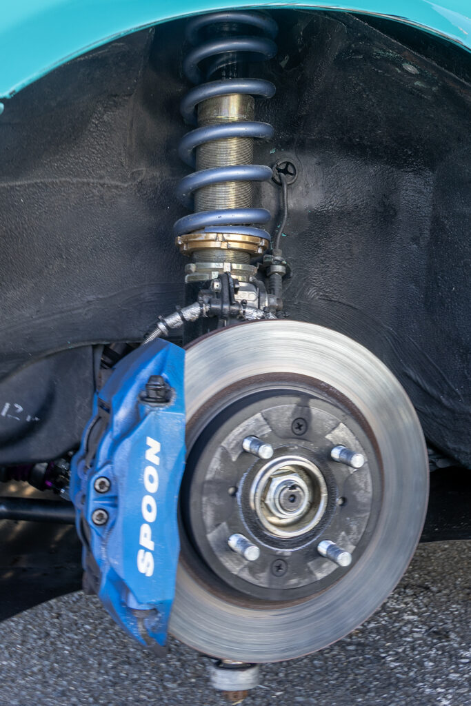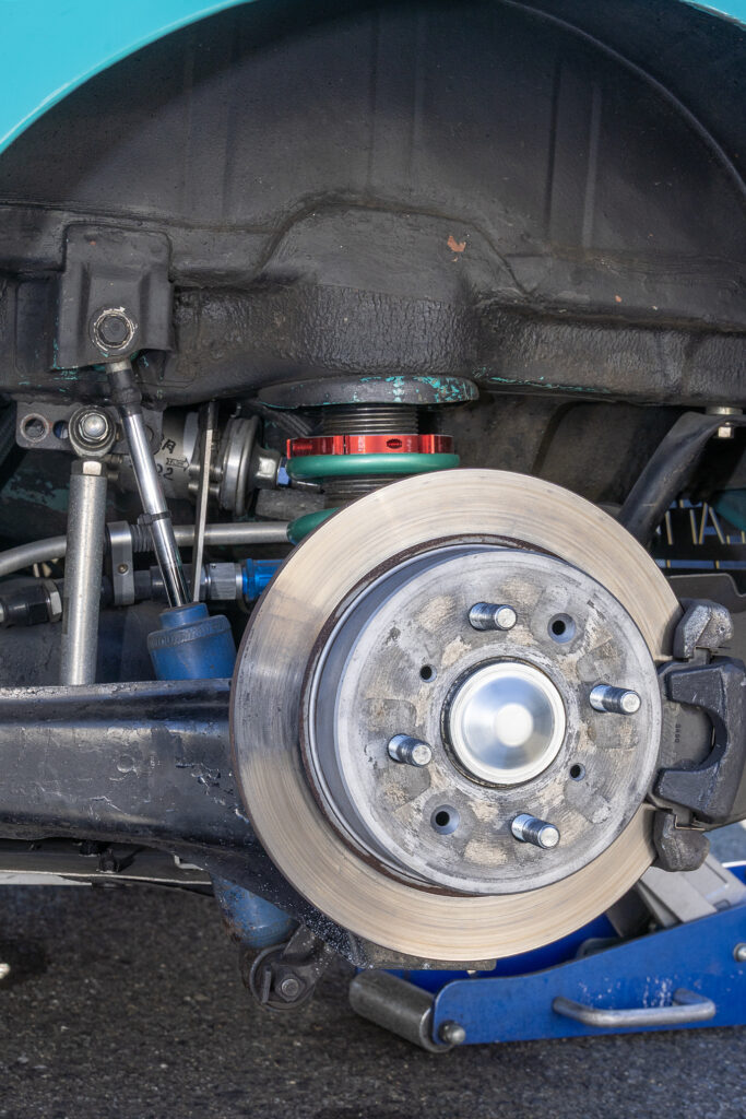 ピーキーなエンジン特性とそのパワーにミッションが耐えられず2025年は7回行ったサーキット走行のすべてでミッションが壊れている。そのためCR-Z用6速MTの換装を決行。フライホイール、クラッチもCR-Z用をE07Zエンジンに使用できるようにパーツ側を加工している。また、トゥデイはワイヤー式のクラッチだったがミッション変更で油圧式になった。ドライブシャフトはN-BOX用を加工して使う。今回はテスト走行を兼ねての参加だったがおおむね良好。前回と異なるポイントはブレーキの強化。フロントにスプーンの4POTキャリパーを採用した。