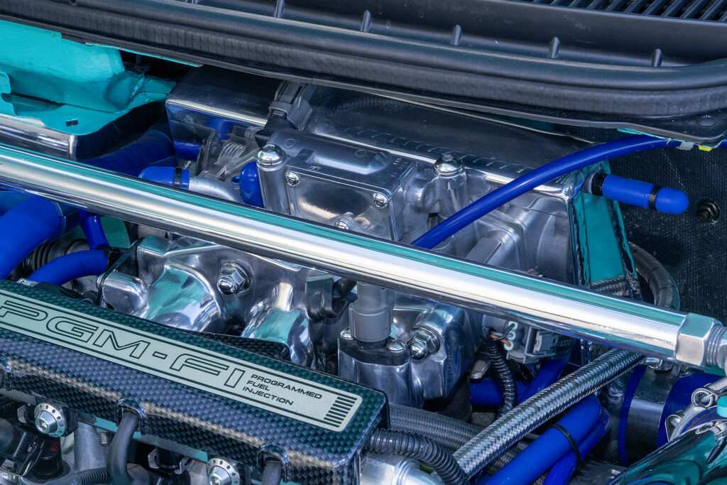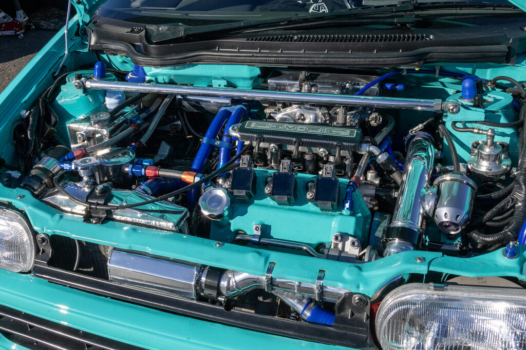 ターボ仕様のE07Zを ベ ー スにピ ストン、コンロッド、クランクシャフトを強化したうえ、タービンはRB26DETT向けのGCG GT2860Rを装着。2025年は大パワーが影響してミッションブローを7回経験。