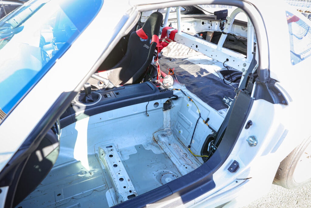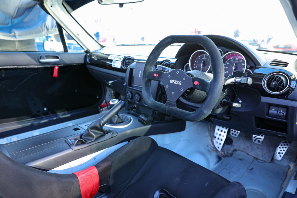 「コスパよく楽しく速く走れる仕様」を追求しており、ダッシュボードやセンターコンソールは残しつつも助手席やトランクまわりを軽量化。ハードトップ換装により車両重量を1031kgまで絞った。エンジンまわりは吸排気系とECUのみで、重視しているのは足まわり。Odulaのダンパーにスウィフトのスプリングを組み合わせている。L.S.D.はトルセンだが、1分3秒204をマーク。