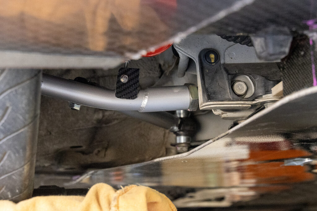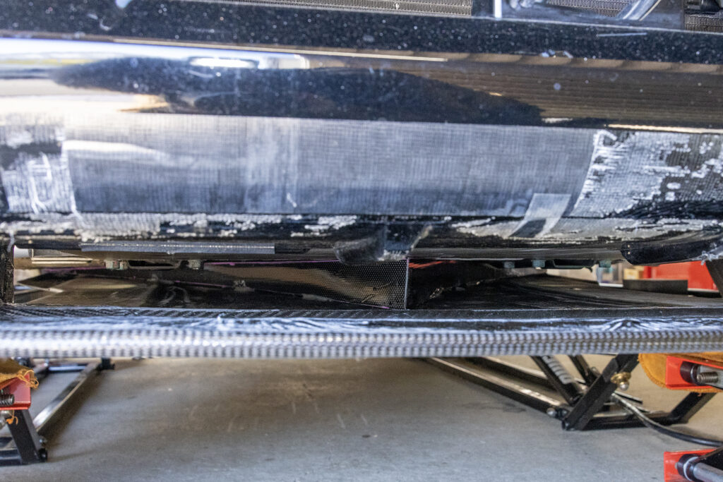 フロントのハイキャスター化の結果はアンダー対策にはよい方向に出たが、前後のステアバランスではネガティブな部分もあったのでテストは継続中。今回は下面の空気を整流してダウンフォースを高めるエアロを装着してきた。フロントとリアのトータルで10kgほどのダウンフォースを掛けることができたことを確認している