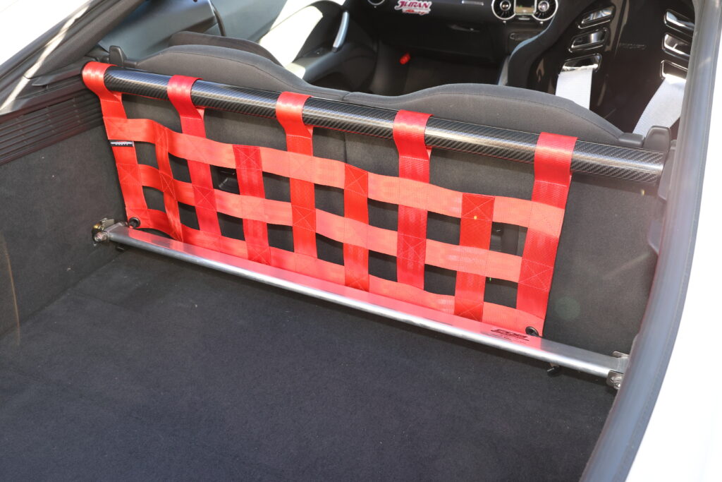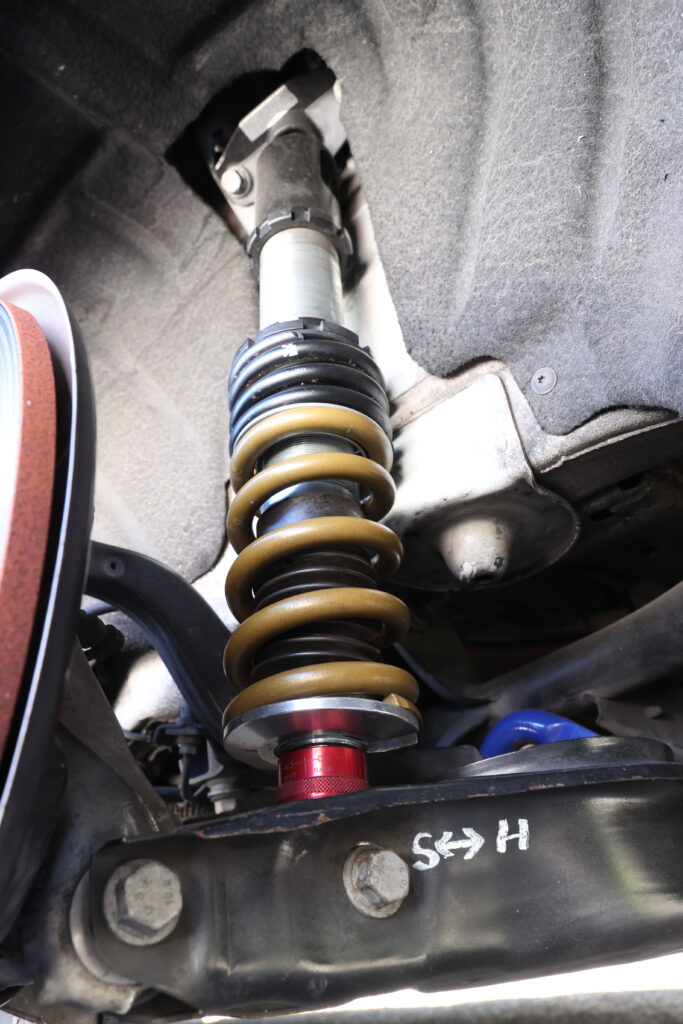 CTSのIS38ハイフロータービンで、最大ブーストは2.0㎏/㎠設定時に430psをマーク。排気系はIEのフロントパイプにキャタライザー、レムスのマフラーという構成。HYR2way車高調キットはリアがコイルオーバータイプで、リアスタビをスーパープロの強化品に変更。タイヤは前後265サイズとなるRE-12D TYPE Aを装着