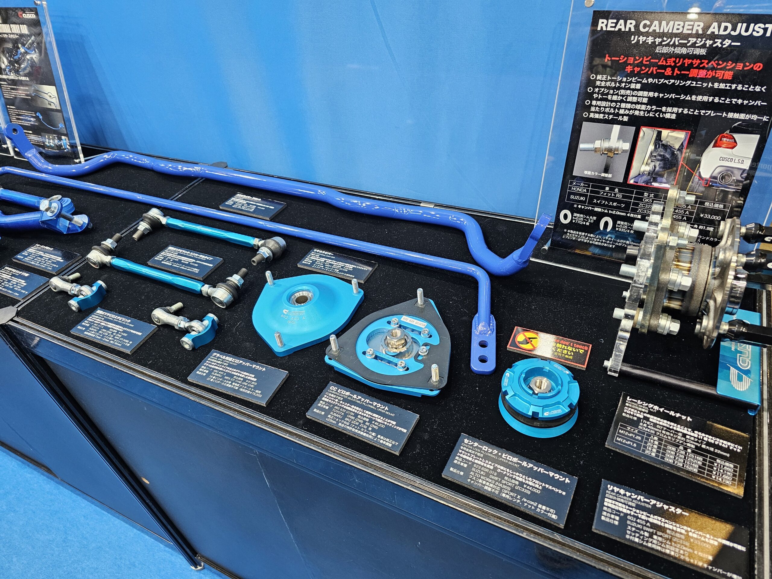 CUSCOがサポートする競技は広く、サーキットやジムカーナをはじめ、ラリーやダートラにまで至る。パワーブレースなどの補強パーツは充実していて、その機能がよくわからない人向けの展示も充実している。車高調キットはツインニードルによる伸縮別調整スポーツTNシリーズから、ストリート用まで多彩なラインアップ。用途に合わせて最適な選択ができるようになっている。