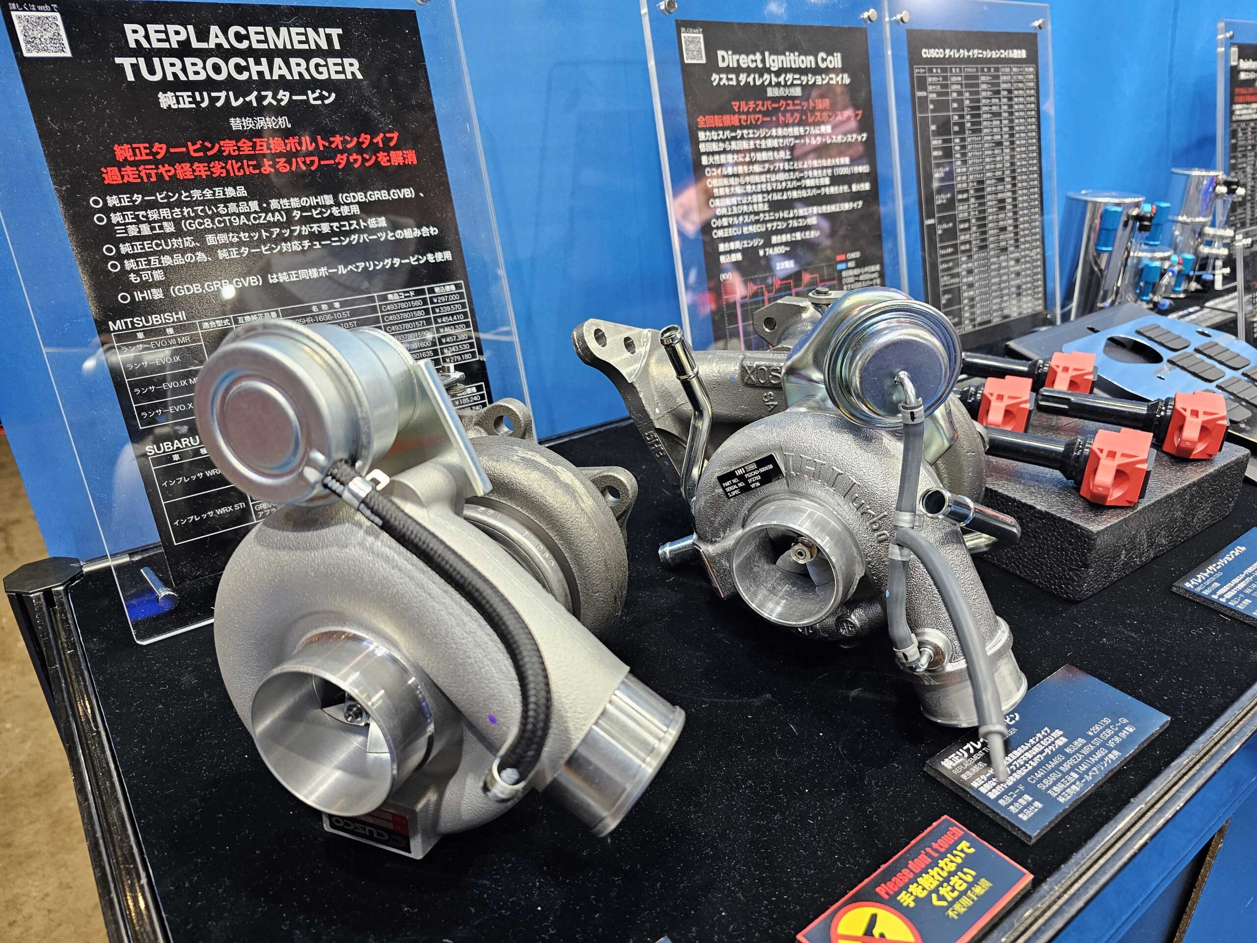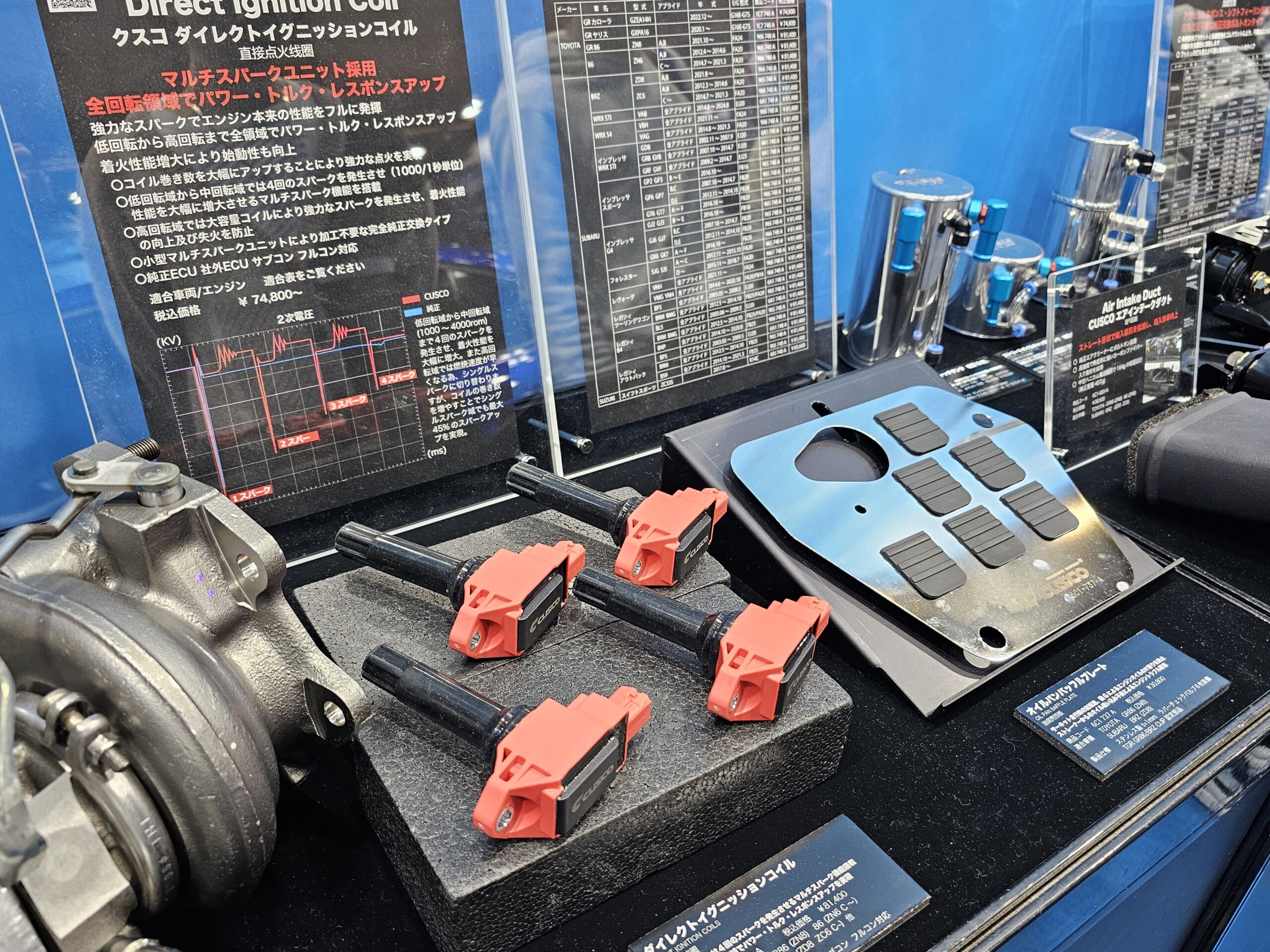 さらに実寸大のBRZのシルエットに実際の補強パーツを装備した展示や、純正交換タイプのタービン、L.S.D.やクラッチなどの駆動系パーツ、車高調サスキット、ダイレクトイグニッションコイルなどをはじめとする、お馴染みのアイテムが置かれていた。
