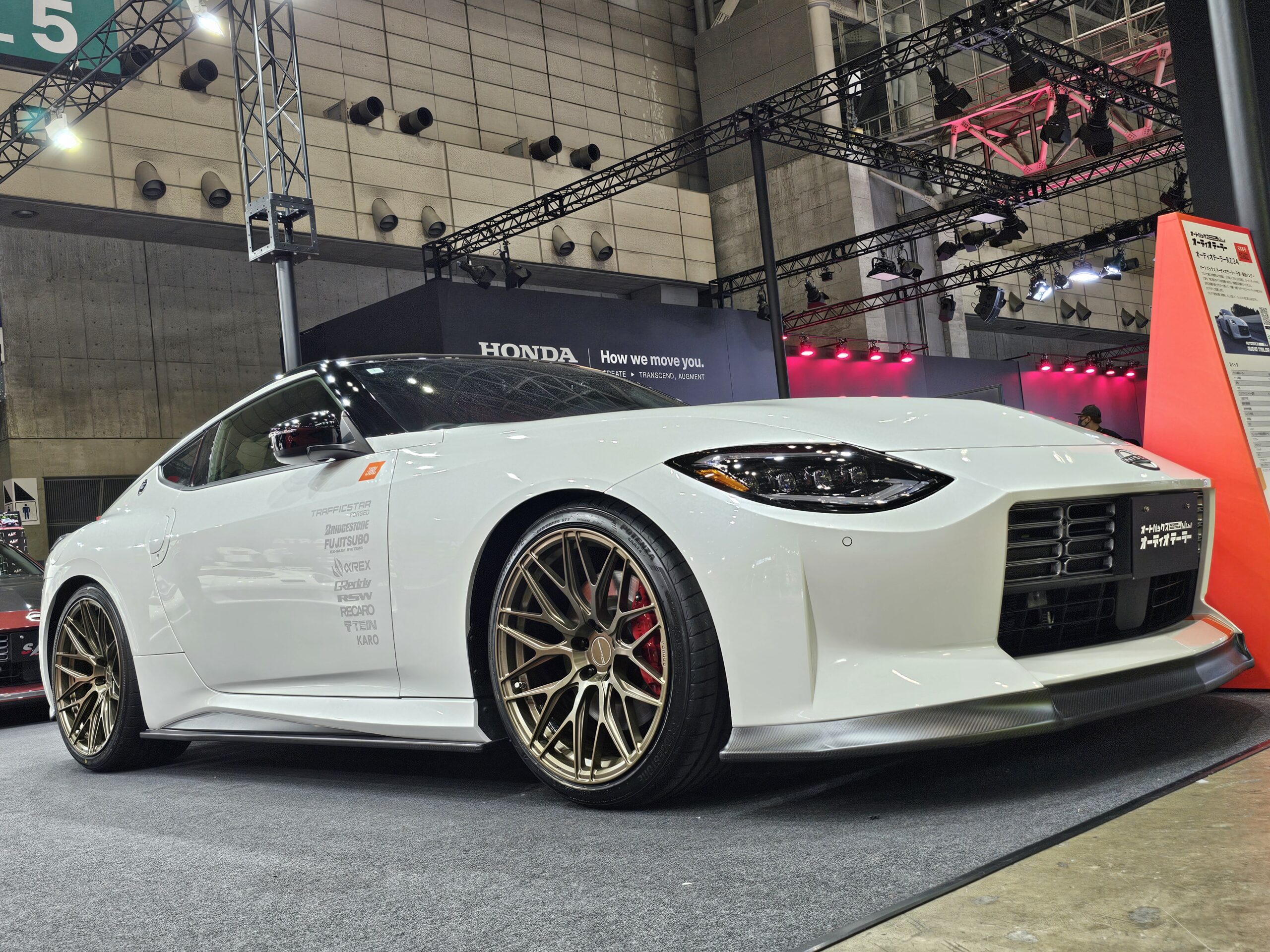 オーディオテーラー千葉・蘇我インター店のRZ34はサウンドチューニングのレベルの高さを見せ、実際の音響を視聴できるクルマとして展示。