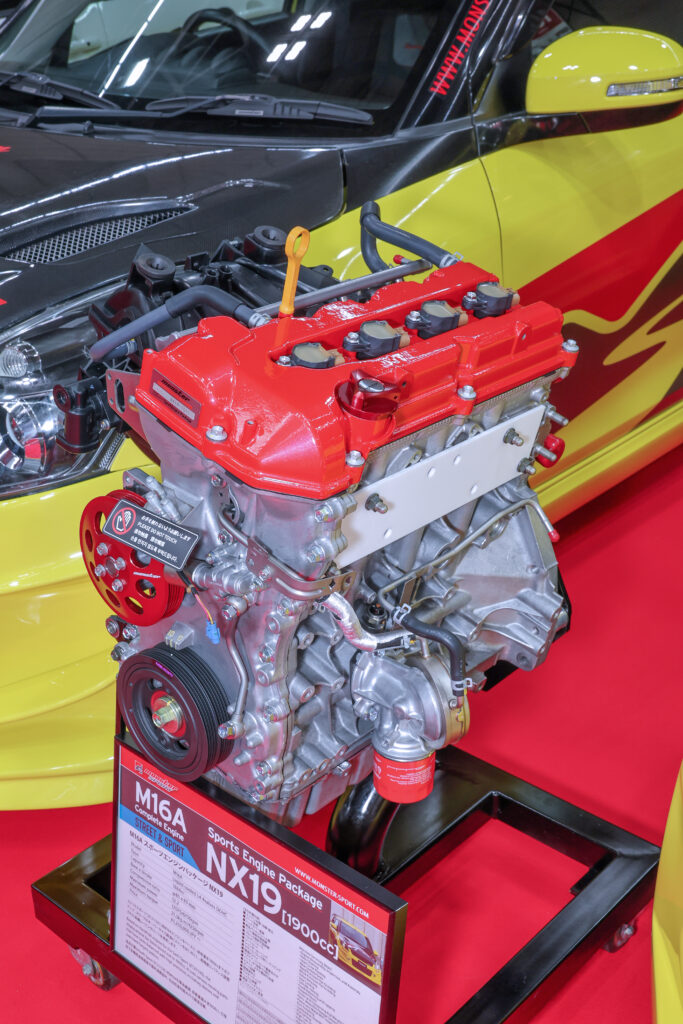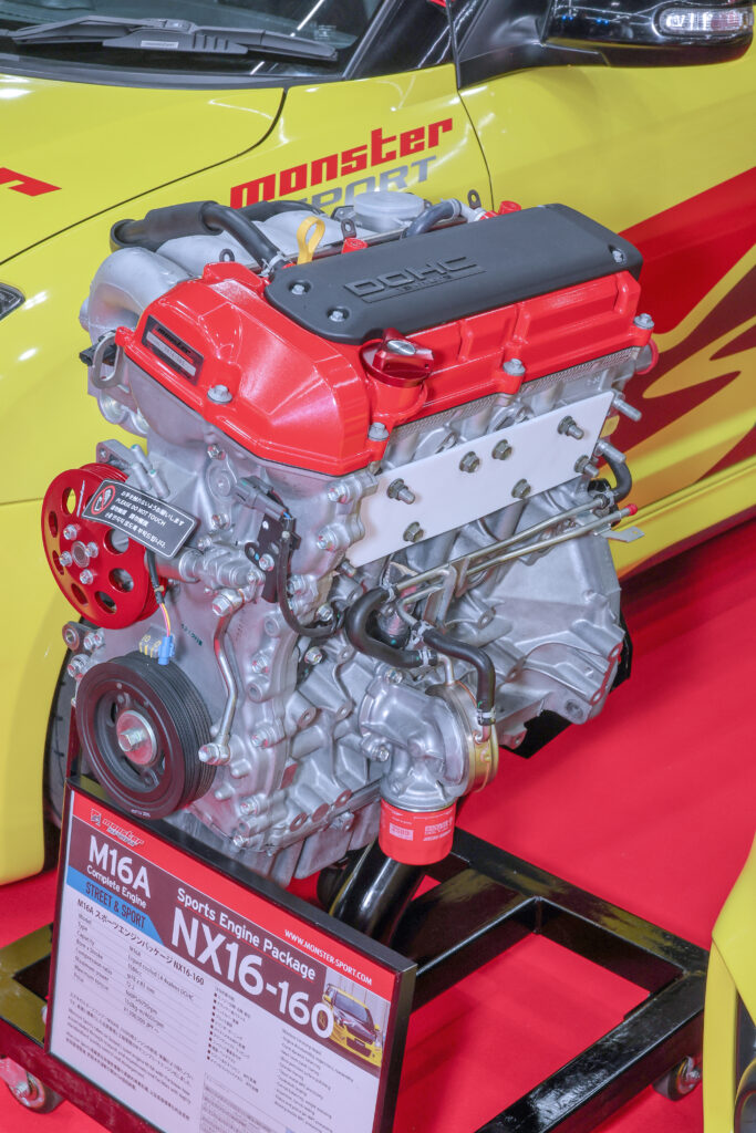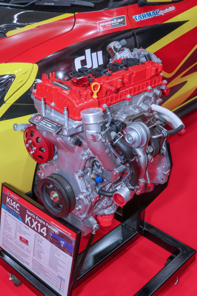 コンプリートエンジンではM16AベースのNX16-160とNX19に加えて、目玉となったのはZC33S用KX14スポーツエンジンパッケージ。オーバーホール時期の車両やステップアップに、モンスターが腕をふるってK14Cエンジンを開発中。K14C用にパーツ単体では、試作φ73.25鍛造ピストンと試作ハイフローカムシャフトが公開された。
