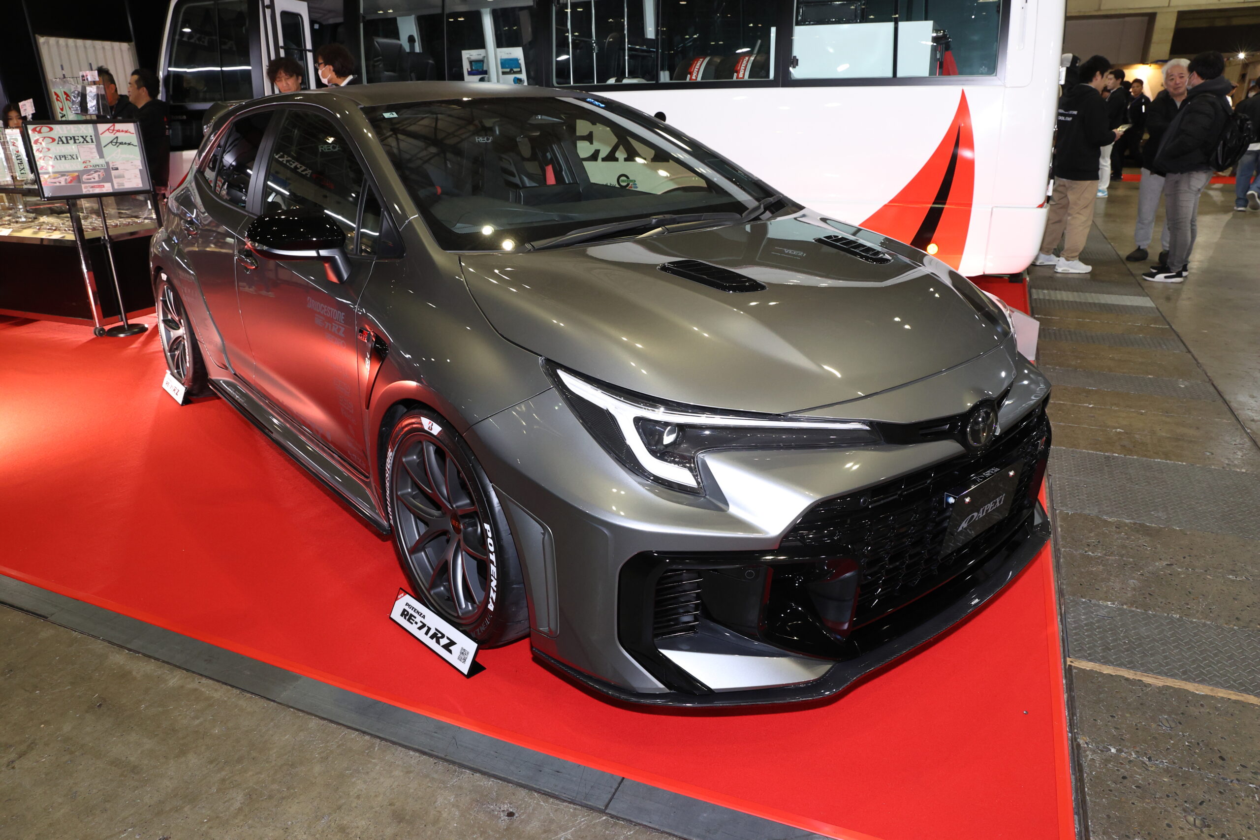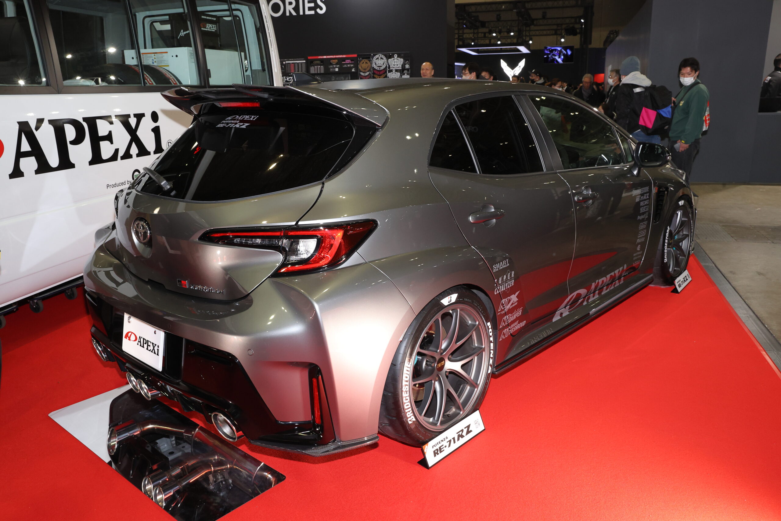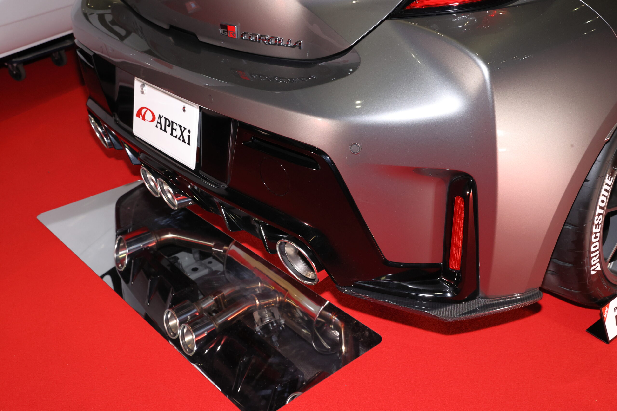アペックスはGRカローラをN1エボリューションダンパーやスーパーキャタライザー+N1エボリューション・エクストリームマフラーなどの自社製品で一式コーディネート。