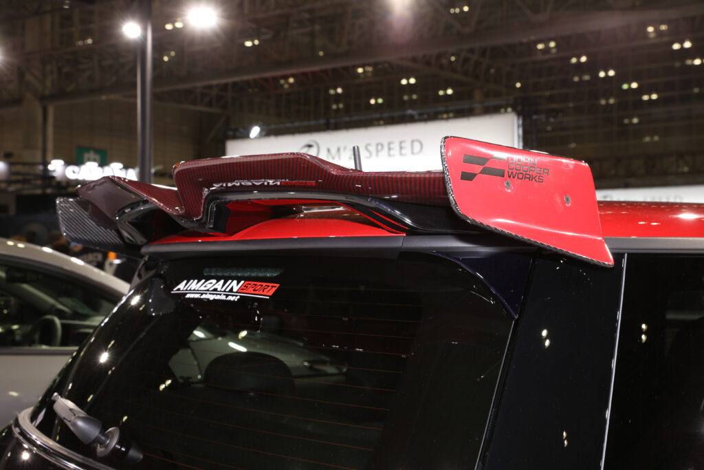 ミニJCWはフロントアンダーとサイドアンダー、リアディフューザーにリアウイングを装着。マフラーにはディフューザーをマッチするオリジナルのカーボン製マフラーカッターを装備していた。