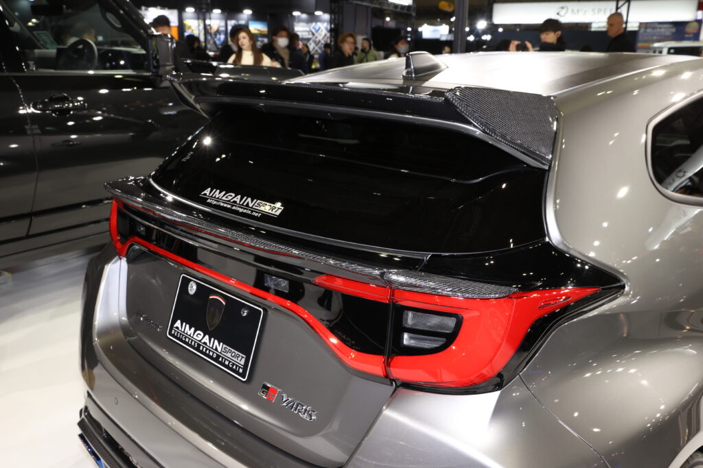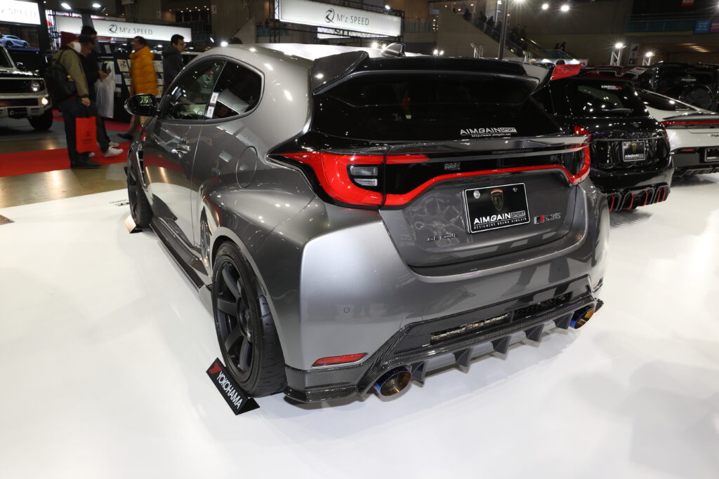 GRヤリスはボトムまわりのエアロパーツに加えてリアウイングとデッキスポイラー、カナードをセット。このクルマはオートサロンのカスタムカーコンテストでドレスアップ・コンパクトカー部門の最優秀賞を受賞している。