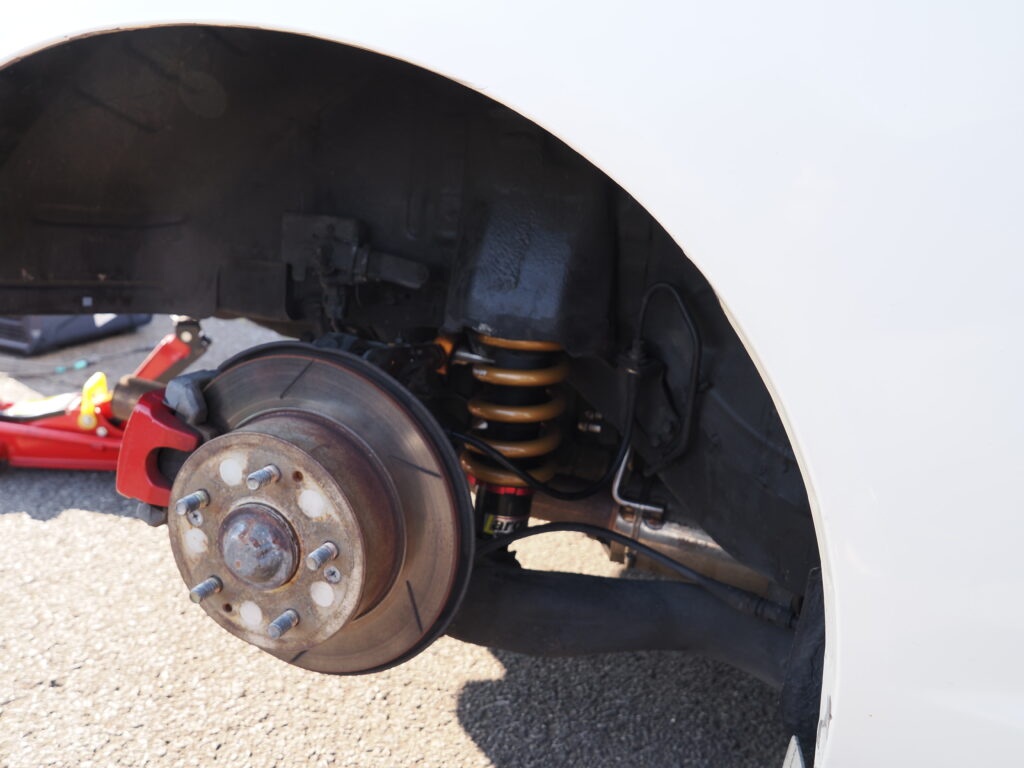 足まわりはラルグスのスペックDサスペンションをベースにスプリングレートを変更したオリジナル仕様。ブレーキはスリット入りローターとエンドレスのCC32ブレーキパッドを装着。