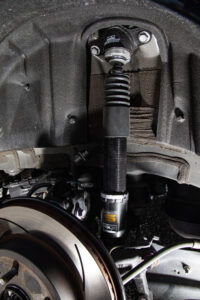 アルミアッパーマウントはマットな質感のものに変更。ピロアッパータイプと純正よりほどよく引き締めた強化ゴムタイプの選択が可能だ。
