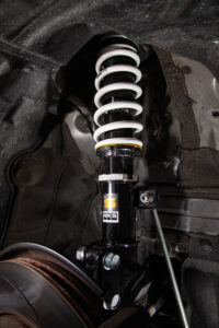 全長調整タイプの単筒式(ストラットはかつ倒立式)で減衰力30段階調整機構付き。オーバーホールや仕様変更可能で、3年6万kmの保証もついてくる。