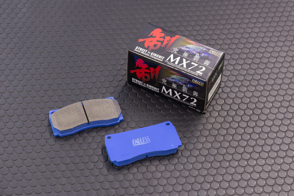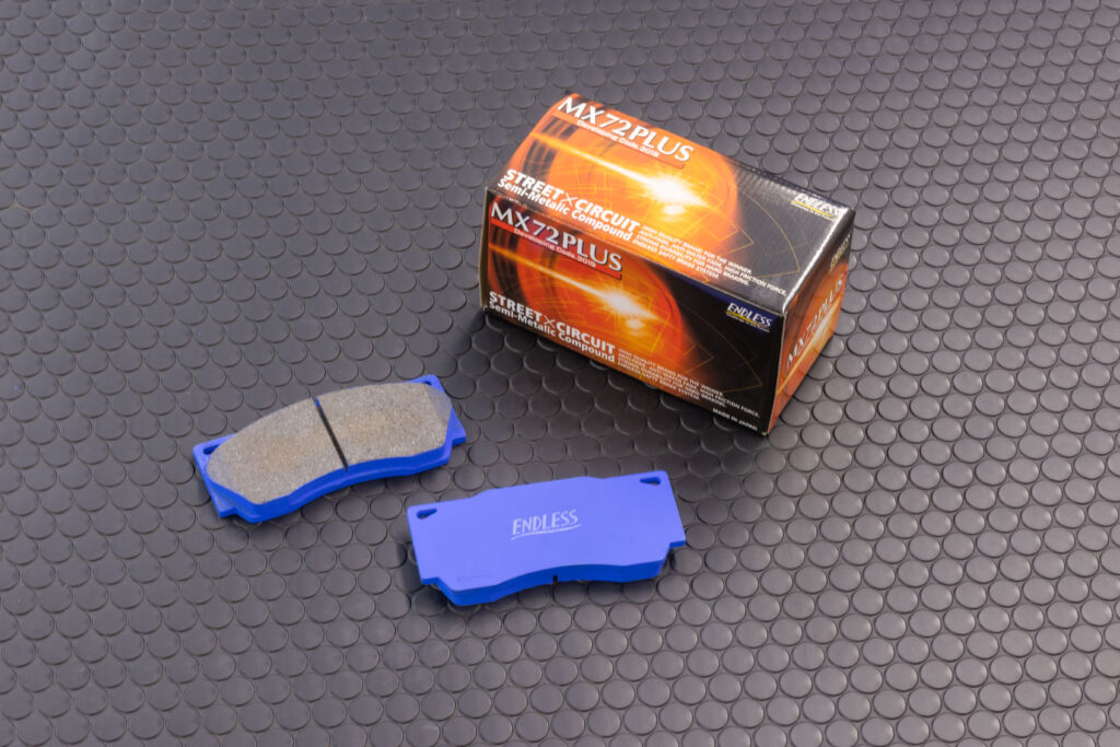 エンドレスのスポーツパッドのど真ん中といえる存在がMX72。自然なビルドアップと効きで違和感なく使える。コントロール幅の広さを持ちながらも初期から奥までしっかり効く。セミメタリック素材ながら、鳴きが発生しにくく、ダストも落ちやすい特性を持つ
