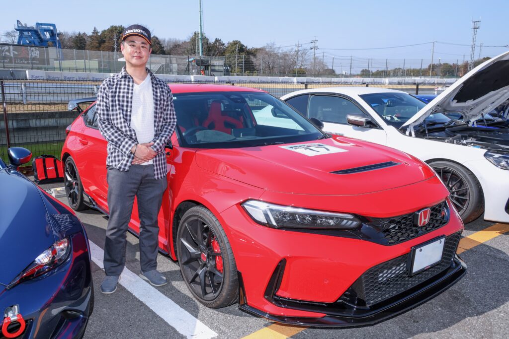 「サーキットは15年ぶり。以前はFD3Sで結構、筑波を走っていました。このFL5は1年ノーマルで乗って、今回のためにブレーキパッドを換えてきました。ひさしぶりですし、クルマも高性能。初めから思いきった操作は難しいので、まずプロドライバーがどのくらいの力でブレーキを踏むのか、見させてもらいました。久保講師から『ブレーキはよく効いて、しっかり減速できる。ただ、いまのタイヤのグリップは相対的に縦方向が強く、横方向へ移すのに繊細なコントロールを覚えてほしい。できるようになれば、横のグリップも強いタイヤを履いたときに、抜群に運転が上手くできる』と、アドバイスを受けました。実際にブレーキのリリースでタイヤのグリップを横方向にするとき、ちょっと腰砕けを感じました。勘を取り戻しつつ走っているところです」