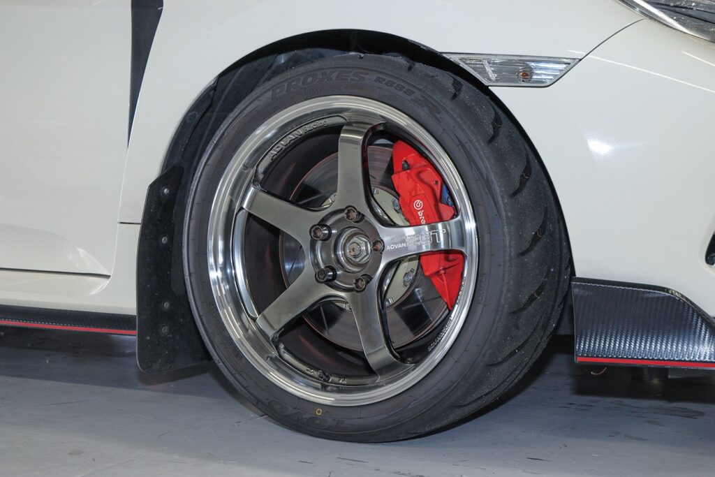ブレーキはローターとパッドを強化。ローターはフロントにProjectμ製2ピース、リアはDIXCEL 製スリットローターを選択。パッドは前後ともENDLESS MX72PLUS をセット。タイヤはプロクセスR888R(265/35R18)だ。