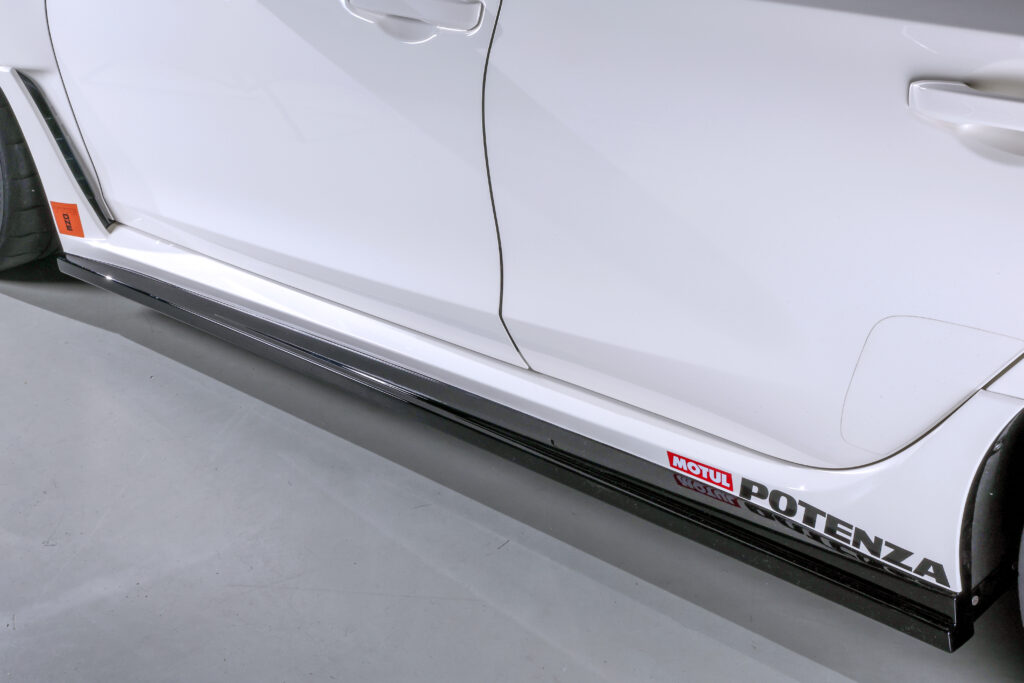 新製品のサイドステップは前後バンパーの空力効果をアシストする。フロントホイールハウスからの空気の流れがコントロールされ、リアタイヤ側への干渉を抑える。ボディ下面への空気の流入も防ぐ。22万円。