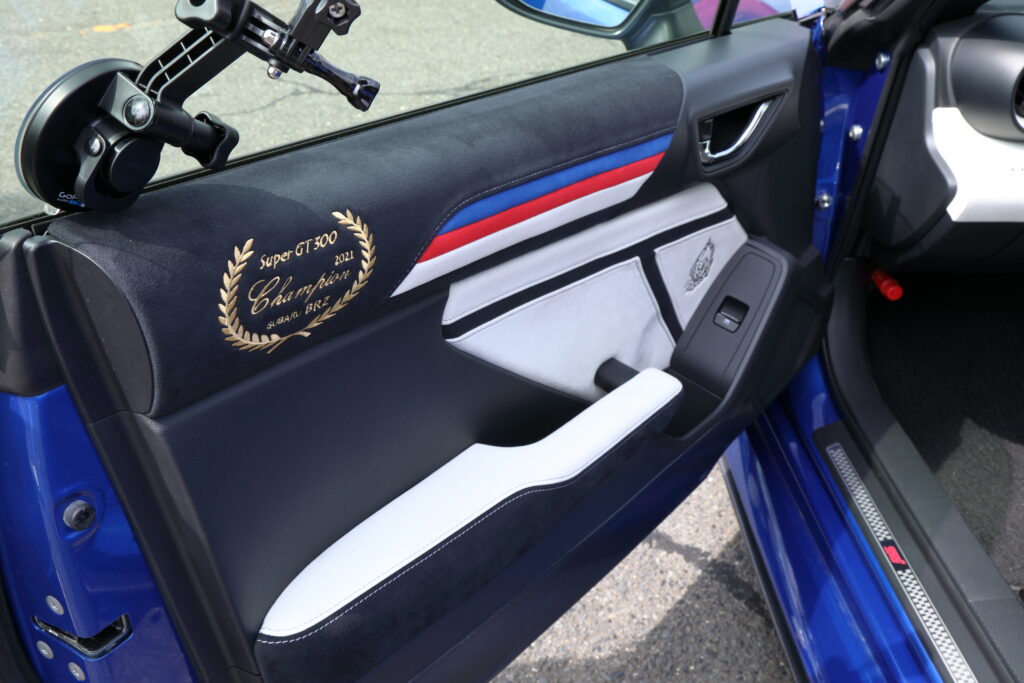 内装は自動車メーカーの内装部品を製造する、しげる工業のカスタムラインで仕上げた。各部にスエードを配し、ドアトリムにはGT300チャンピオン獲得の刺繍が備わる。青のラインでSUBARU、赤でSTIも表現