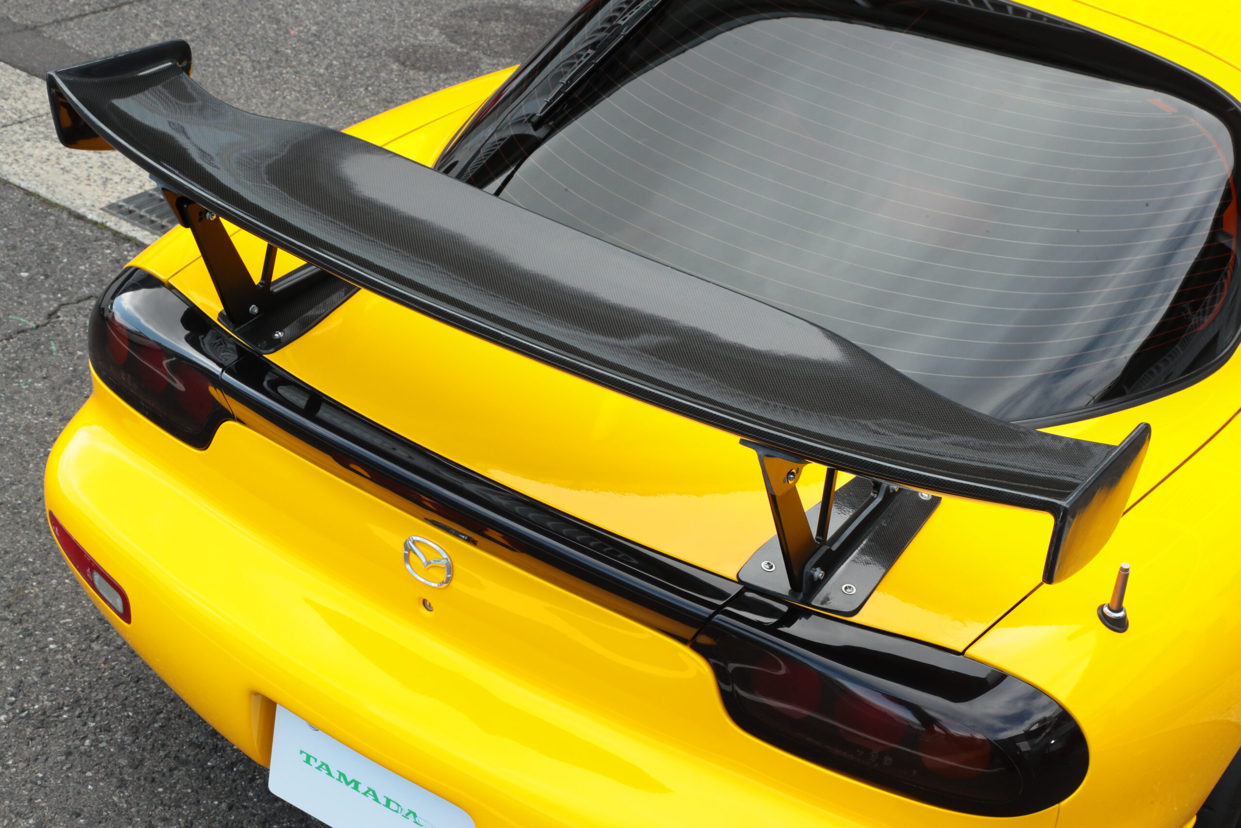 ロー&ワイドなFD3Sらしい美しいリアビュー。ストリートユースを軸にしながらも、走りの本気度が伝わるフォルムだ