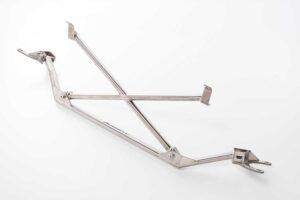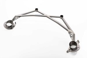 『ストラットタワーバー(チタン)』は1ピース4点式クロスバー構造に、バーリング加工を施したガセットを組み合わせた設計。強固な一体構造で高剛性を確保しながら、重量は2.0kg(純正比約96%)に抑えている。
